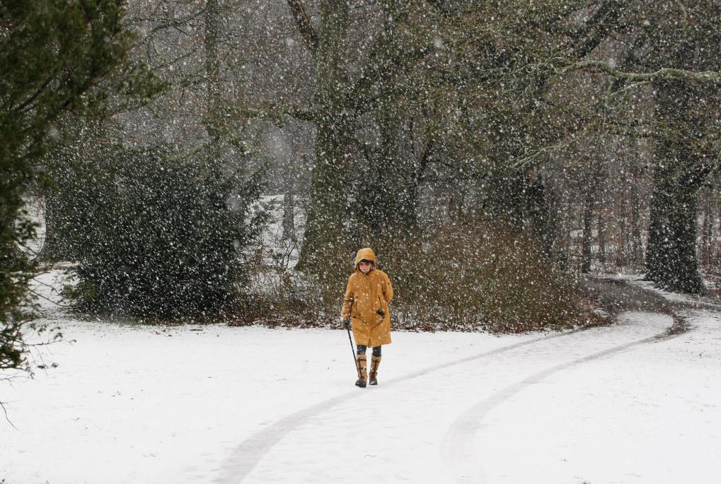 1月4日,在荷蘭海牙,一名女子冒雪在公園內(nèi)散步。新華社記者 邵海軍 攝