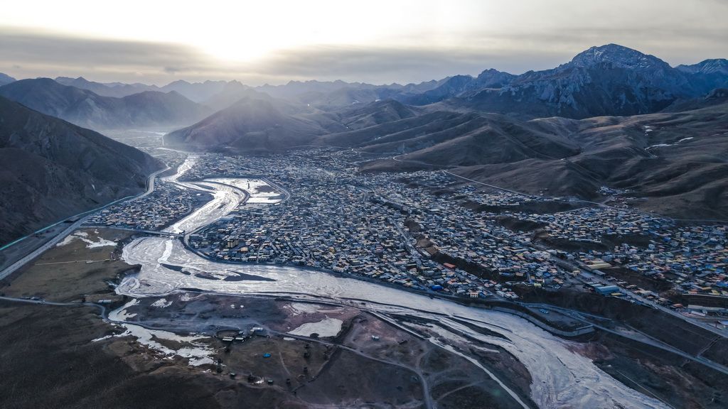 這是1月30日拍攝的青海省玉樹藏族自治州雜多縣冬景風光(無人機照片)。