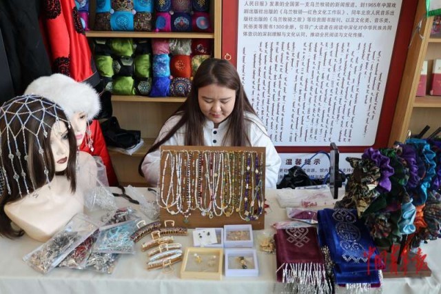 1月30日,在蘇尼特右旗非遺年貨現場,展出的具有蒙古族特色的頭飾、發(fā)飾、項鏈。