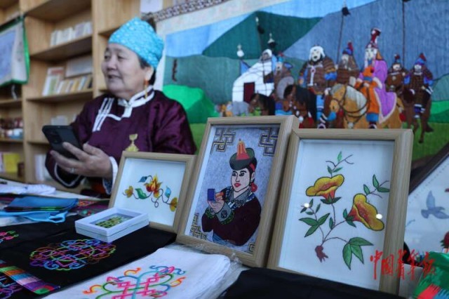 1月30日,蘇尼特右旗非遺年貨現場的蒙古族刺繡作品。