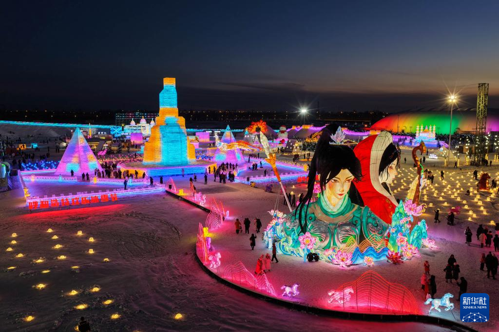 人們?cè)诤艉秃铺氐谖鍖脷g樂冰雪節(jié)上游玩(2025年12月31日攝,無人機(jī)照片)。