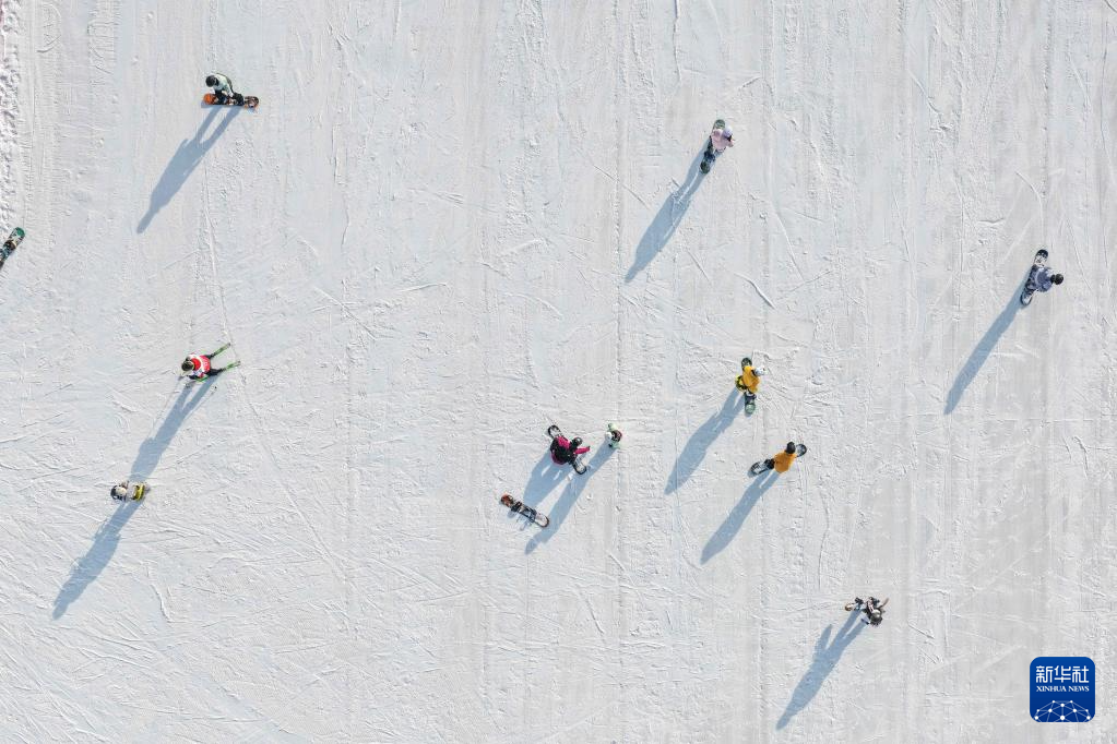 人們?cè)诤艉秃铺伛R鬃山滑雪場(chǎng)滑雪(2025年12月14日攝,無人機(jī)照片)。